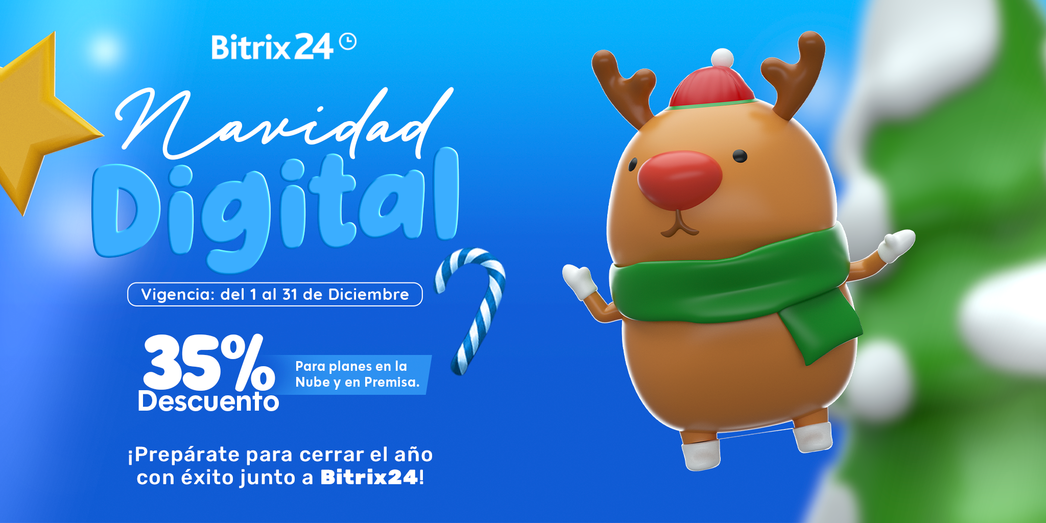 La Oferta Navidad Digital es válida desde el 1 de diciembre hasta el 31 de diciembre de 2025, para suscripciones en la Nube de 12 meses, así como para las Ediciones En Premisa Bitrix24 Business 50-500 y Enterprise 1.000. Los descuentos están disponibles para los suscriptores del Plan Gratuito de Bitrix24 que no hayan tenido una suscripción comercial previa, y para los suscriptores actuales que actualicen a un plan de nivel superior o cambien a la facturación anual. Para los suscriptores actuales, el descuento aplica únicamente a las suscripciones completas de 12 meses y puede requerir desactivar la renovación automática para calificar.Los descuentos no son válidos para renovaciones o actualizaciones al mismo plan que estuvo activo en la cuenta dentro de los 30 días previos al inicio de la Venta. Para las compras promocionales realizadas en una cuenta en la Nube con una suscripción activa, la conciliación de la fecha de finalización se completará dentro de los 3 días hábiles posteriores a la fecha de finalización de la venta. Todas las futuras renovaciones de suscripción se facturarán al precio normal. Si tienes alguna pregunta envíanos un e-mail a ventas@killalab.com